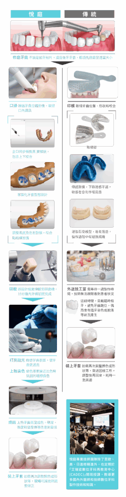 像台北悅庭牙醫這種的新一代的「全數位牙科診所」,診所內就備有3D CEREC全瓷設備,可以直接進行全瓷牙冠的製作與研磨,省去傳統療程數周的等待時間。悅庭更在診所內就建有全瓷中心與一日美齒中心,從假牙的設計、製作到裝戴流程都數位化且非常準確、迅速,能大幅縮短在一天內完成,並確保牙體的美觀與耐用性。